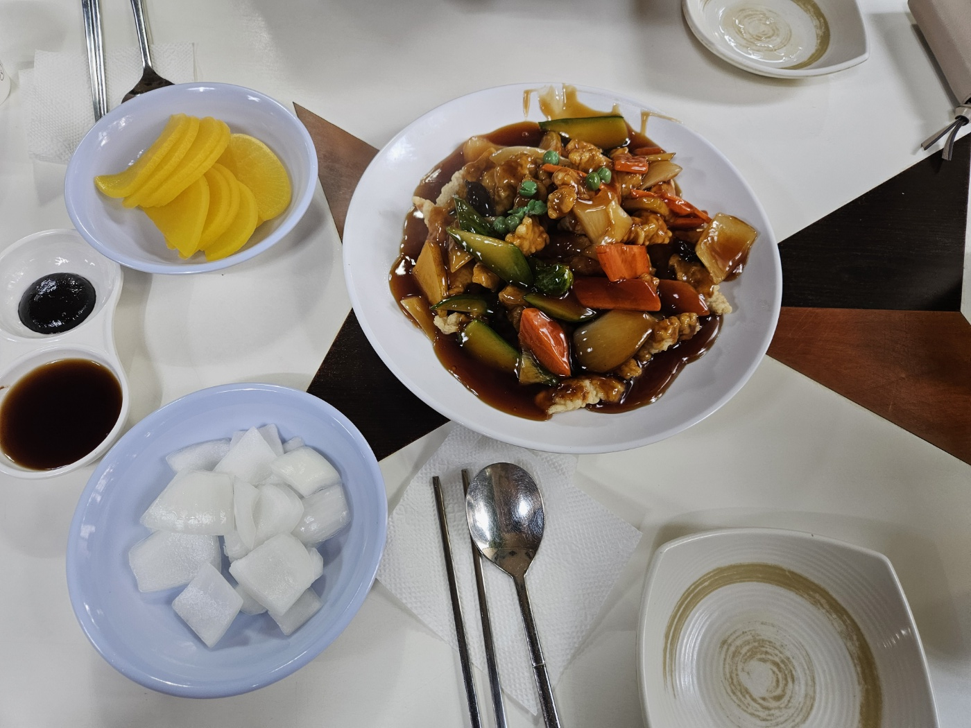 메뉴 및 가격: 동화장은 다양한 한중 전통 요리를 제공합니다. 대표 메뉴는 자장면 약 7,000원, 짬뽕 약 8,000원, 탕수육 약 18,000원입니다. 중간 크기로 제공됩니다.