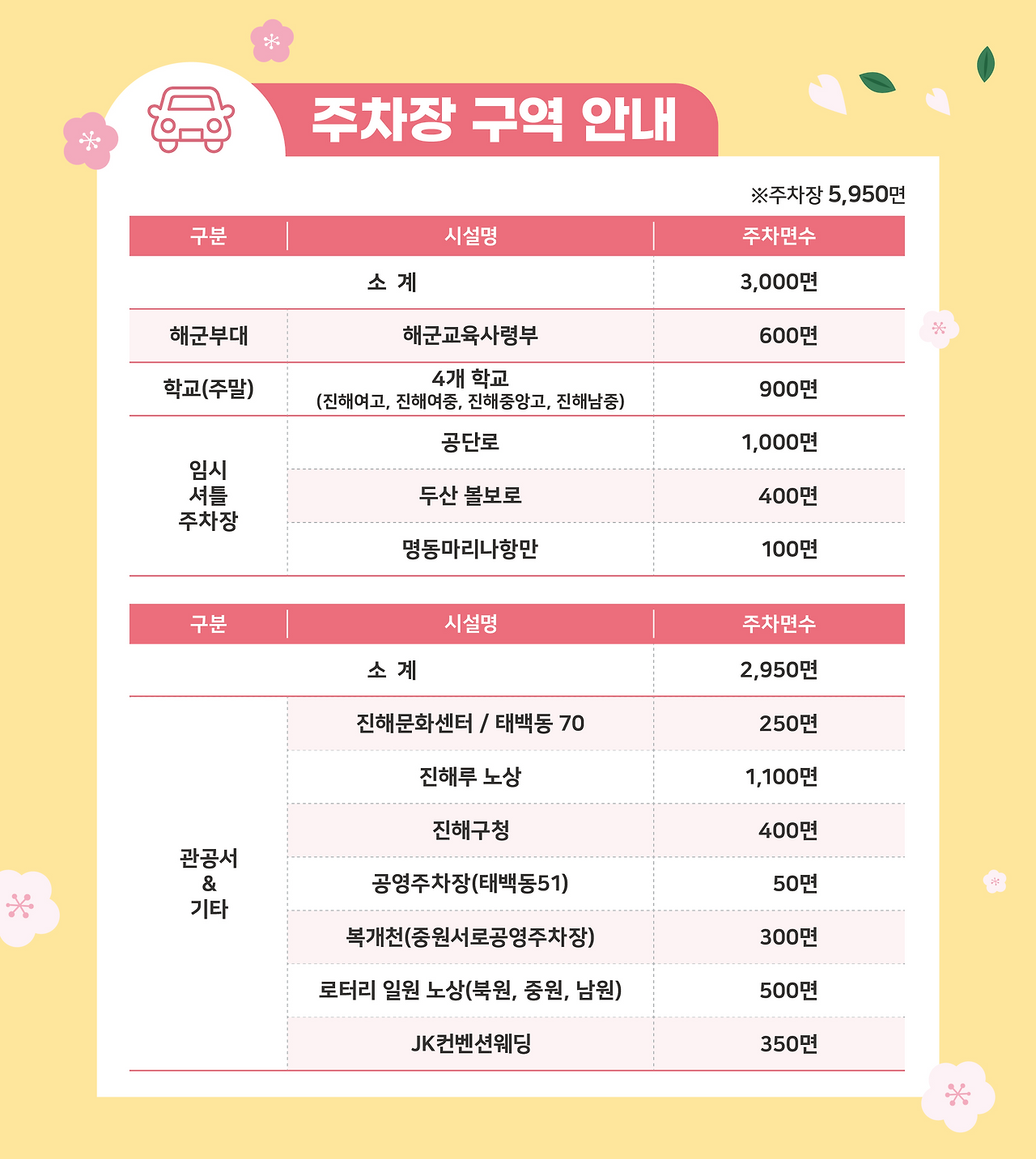 2026 진해군항제 공식 주차장은 총 5,950면 규모로 운영됩니다. 크게 임시 셔틀 주차장(3,000면)과 관공서·기타 주차장(2,950면)으로 나뉩니다.
